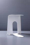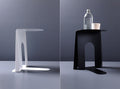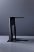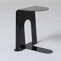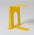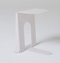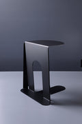 だれもが見かけたことのあるスチール製のブックエンドをそのまま大きくしてたような親しみのあるフォルムが特徴のミニテーブルです。一枚のスチールシートから切り出した部品を曲げるだけというシンプルな工程で完成します。ベッドの脇、ソファの脇などでちょっとコーヒーカップを置いたり、くつろぎのスペースに丁度良くお使い頂けます。もちろんテーブルの下には本や、雑誌がが立てておけるブックエンドになっています。テレビボードの上などに設置しても丁度よいデザインです。