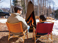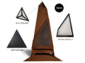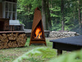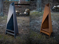 煙突効果のある三角錐の形状が煙を上へと送り、快適に焚き火が楽しまめす。また、よりダイナミックな炎を楽しむために、開口部を大きくとったデザインにこだわっています。炉床の下にヒートシールドを設けることにより地面への熱の伝わりをガードし、床面温度50℃未満を達成しています(ファイヤーサイド独自テスト)。また脚部に開口を設けて空気の流れを生み出すことで、設置面への熱の影響を少なくします。脱着できる炉床により、灰の掃除がしやすい仕様です。