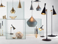 Beat Floor は真鍮の独自の表情が美しいフロアランプです。シェード部分は北インドにて熟練した職人により、真鍮板をまわしながらひとつひとつ手打ちで製造されています。元々は水瓶やオブジェを制作する為に使われていた技術を、Tom Dixonが照明器具と言う全く異なった用途を考えだしただけでなく、工芸品をデザイン・オブジェに昇華させた名作です。シェード内に設置された光源はシェード内を反射しながら、シェードの周辺をほのかにやさしく照らします。フロアモデルは全高168cmと圧迫感なく使いやすいサイズで、上部のアームが180°可動します。読書ライトとしてソファ脇や、ベッドサイドなどに、または純粋に空間に設置しても様になる使いやすいデザインです。