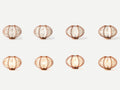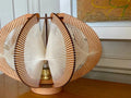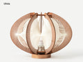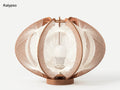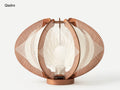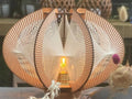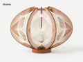 Echino - Lamp on Base、7枚の羽を様々なパターンの糸で包み込むデザインが特徴のテーブルランプです。独自のデザインと、照明を点けたときと、消したときでシルエットが変化するような印象です。さらに見る角度によっても、さまざまに違う表情を見せてくれるのも特徴的な魅力的なランプです。Echinoは直径39cm、中型のモデルで横に広がるような全体のオーバルフォルムが特徴です。