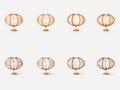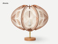 Echino - Table Lampは、7枚の羽を様々なパターンの糸で包み込むデザインが特徴のスタンド式テーブルランプです。独自のデザインと、照明を点けたときと、消したときでシルエットが変化するような印象です。さらに見る角度によっても、さまざまに違う表情を見せてくれるのも特徴的な魅力的なランプです。Echinoは直径39cm、中型のモデルで横に広がるような全体のオーバルフォルムが特徴です。