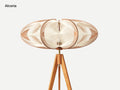 Etiola - Floor Lampは、7枚の羽を様々なパターンの糸で包み込むUFO型のデザインが特徴のフロアランプです。独自のデザインと、照明を点けたときと、消したときでシルエットが変化するような印象です。さらに見る角度によっても、さまざまに違う表情を見せてくれるのも特徴的な魅力的なランプです。Etiolaは直径58cm、大きなUFO型の円形シェードを美しいトライポッド脚の上で楽しむ特徴的なフロアランプです。126cmの使いやすいサイズも魅力的です。