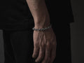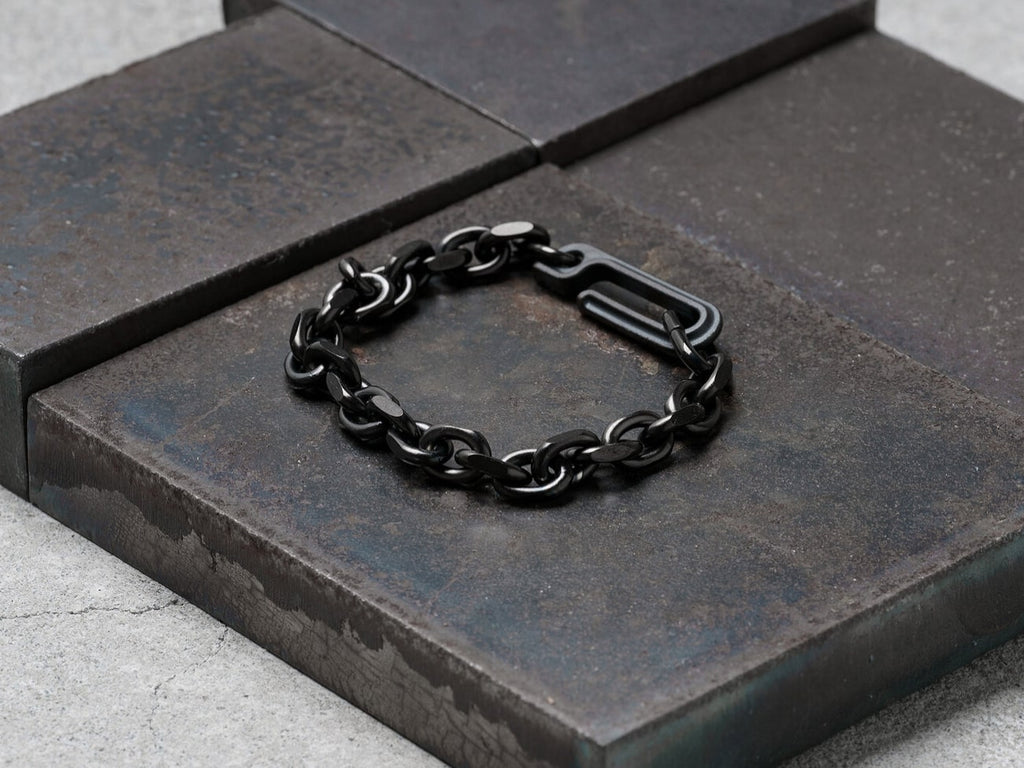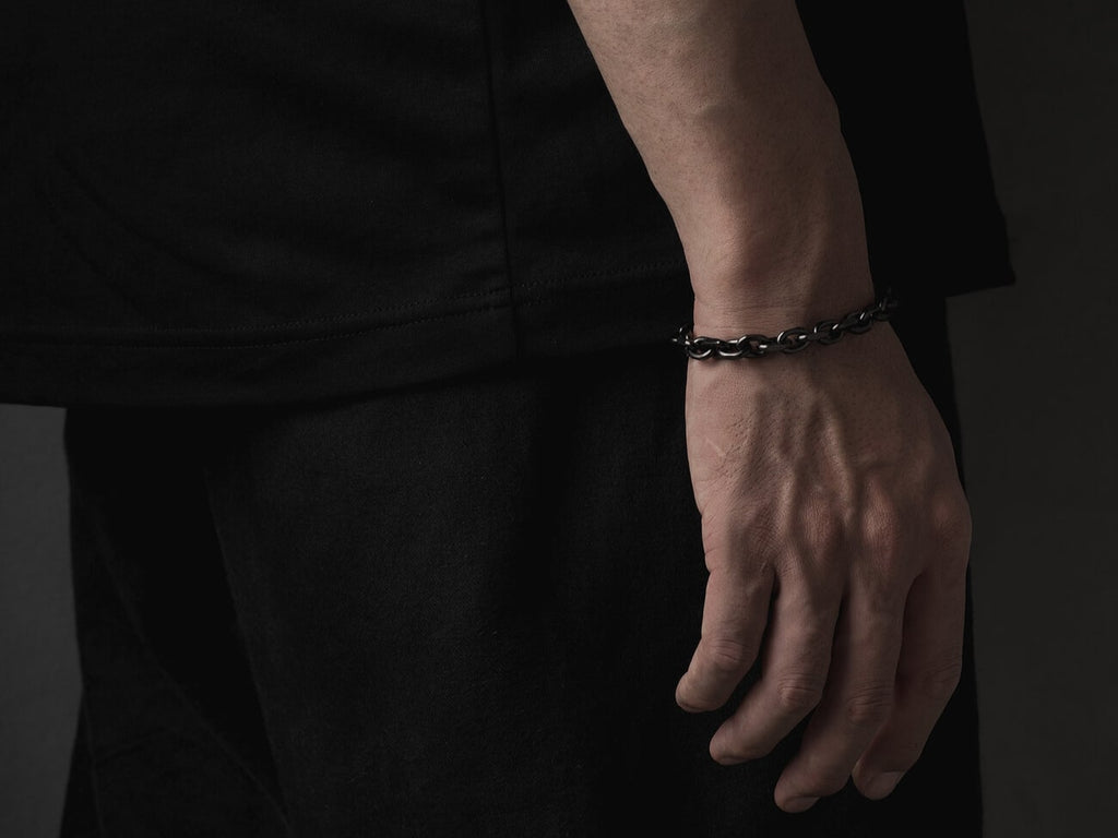 Framework Chain Braceletは、インダストリアルな印象が特徴的なブレスレットです。留め具部分に見られる特徴的な構造は、断面にするとT字の工業製品などに見られる軽量ながら強度を保つための鉄のカタチです。これをデザインのインスピレーションとして利用し、結果としてシンプルながら力強く美しいブレスレットが完成しました。素材は通常のステンレスより、錆びや腐食により強い耐性をもった316ステンレスを使用しています。無骨な印象が魅力的で、ギフトにもおすすめのアイテムです。