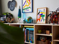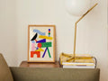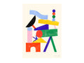Jouerは、若者も大人も遊びに誘うイメージが特徴のアートポスターです。フランス人アーティストAnne Lavalは、木製のスタンプを使用した絵の具のペイントと、手描きのパステルペイントを組み合わせて制作しています。1人の人物が色と形の宇宙の中に座っています。Lavalはシンプルな積み木を探検可能な風景へと見事に変容させました。