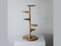 環境配慮の仕組みから作り出されたこちらですが、商品化への道のりは試行錯誤の連続でした。試作では、実際に猫の行動を観察し、上下運動に注目。そこから、木登りをする猫をイメージし、木の枝に見立てたデザインを採用しました。支柱の太さから葉っぱのような丸台まで、美しいとされるプロポーションを意識。丸台はそれぞれ異なるサイズになっていて、バランスの研究を重ねました。