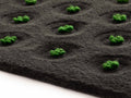 La Geria-Lanzarote Rectangular Rugは、大地と植物のコントラストを大単位表現したラグです。スペインのランサローテ島は、噴火の規模と激しさ、そして非常に短期間に起きたことから、カナリア諸島の中でも火山の痕跡が最も顕著に見られる島です。これほどまでに自然環境の影響を受けた地域は非常に珍しく、住民たちは溶岩地形に適応し、建築や日常生活に取り入れることで、ラ・ヘリアという独自のブドウ栽培を生み出しました。この地域特有の、黒い火山礫(無煙炭)と緑のブドウのコントラストが生む壮大な景観にインスピレーションを受け、Gan Rugs のデザイナーホセ・A・ガンディア=ブラスコ・カナレスはハンドタフティング技法を用いて、その風景を再現したラグLa Geria-Lanzaroteをデザインしました。この技法により、作品内に異なる高さや質感を生み出し、窪地やブドウの木を立体的に表現しています。