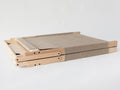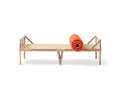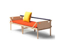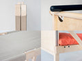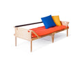 木製のフレームにはメープル材が用いられ、天然木の風合いを生かしたワックス塗装で仕上げられています。また、ヘッドボードとフッドボードをつなぐネイビー色のポールは、構造の強化と背もたれの役割を担っており、簡単に組立・取り外しが可能です。鮮やかなカラーが目を引く付属のマットレスとクッションのカバーは、着脱可能でお洗濯もできるため、いつでも清潔にお使いいただけます。(水温30度、脱水不可)
