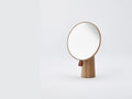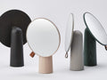 Pivot Mirror は、アイコニックな佇まいと木目の印象が美しいテーブルミラーです。アクセントになっているレザーのタグを持って角度調整が可能で、鏡表面も汚れません。木目が見える5種類のカラー展開で、テーブルやシェルフ、玄関などにそのまま置いてもオブジェのようで美しいです。店舗などでの目が目やアクセサリーの試着用としても魅力的です。