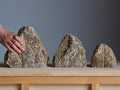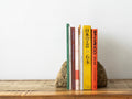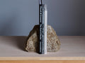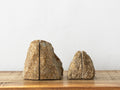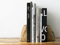 Rock End Sabiは、石の自然な形を活かしたブックエンドです。こちらはブラウン系のサビが入ったようなカラーのモデルです。1つの石を2つに割り、本に接する面と底面は本や設置面を傷めないように研きの加工を施しています。自然石の独特の存在感が生活のアクセントになります。アーティスティックなコーディネートからナチュラルなコーディネートまで幅広くご使用いただけます。