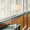 TMD Table Lampは、円筒のクラッシックなシェードを横から支えるテーブルランプです。1961年のデビューから高い評価を得ているTMMフロアランプのコンセプトであるミニマルな構造を生かし、1996年TMMのデザイナーMiguel MilaとSanta&Coleの協働により新たに誕生したテーブルランプです。美しいサテンニッケル仕上げのフレームと白いリネン製のランプシェード、ケーブルを使ったスイッチの仕組みや根元のリングなどはフラッグの構造からイメージされました。