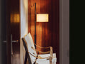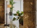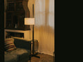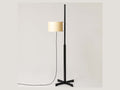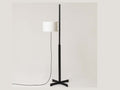 円筒のクラッシックなシェードを横から支えるフロアランプTMMのBlack Oakモデルです。Miguel Miláの代表作の一つです。機能主義を美しい静けさの中で実現した傑作です。十字のベースから伸びる四角の支柱が上に向かう途中で円形の支柱に変化します。これにより、シェードの上下移動機能を美しく実現させています。カジュアルに垂れ下がるコードもしっかりと計算され上品な美しさを誇ります。