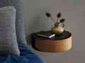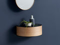 Wallieは、壁面に設置する半円のウォールドロワーです。ブラックのメタルシェルフにオーク合板の引き出しをセットして、マグネット式で全方向に取り出せる便利な仕様です。天板もディスプレイスペースと使用しながら、細々したものは引き出しの中に収納ができます。スタイリッシュなベッドサイド収納として、また玄関ホールで鍵や身の回り品を収納するのにちょうど良いデザインです。